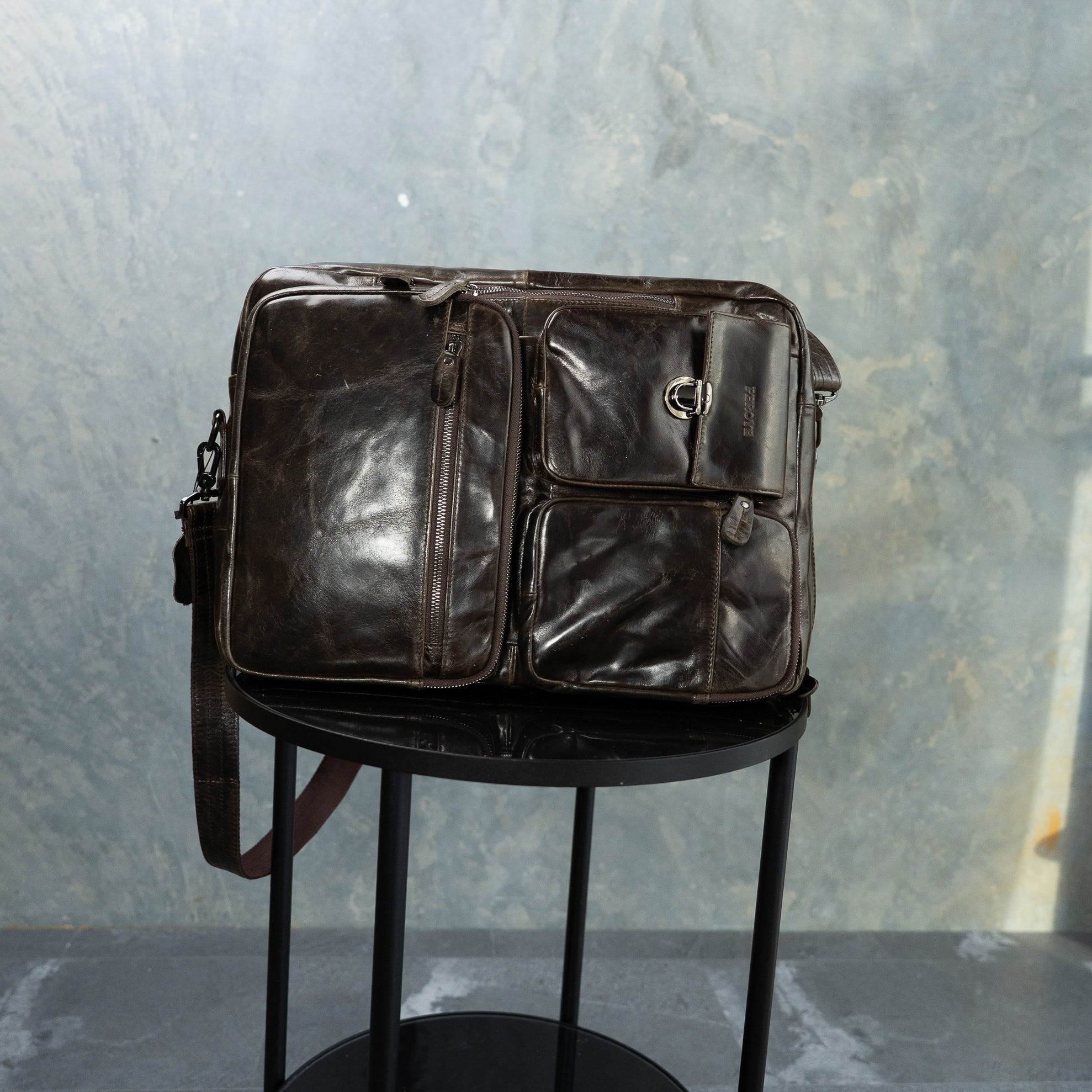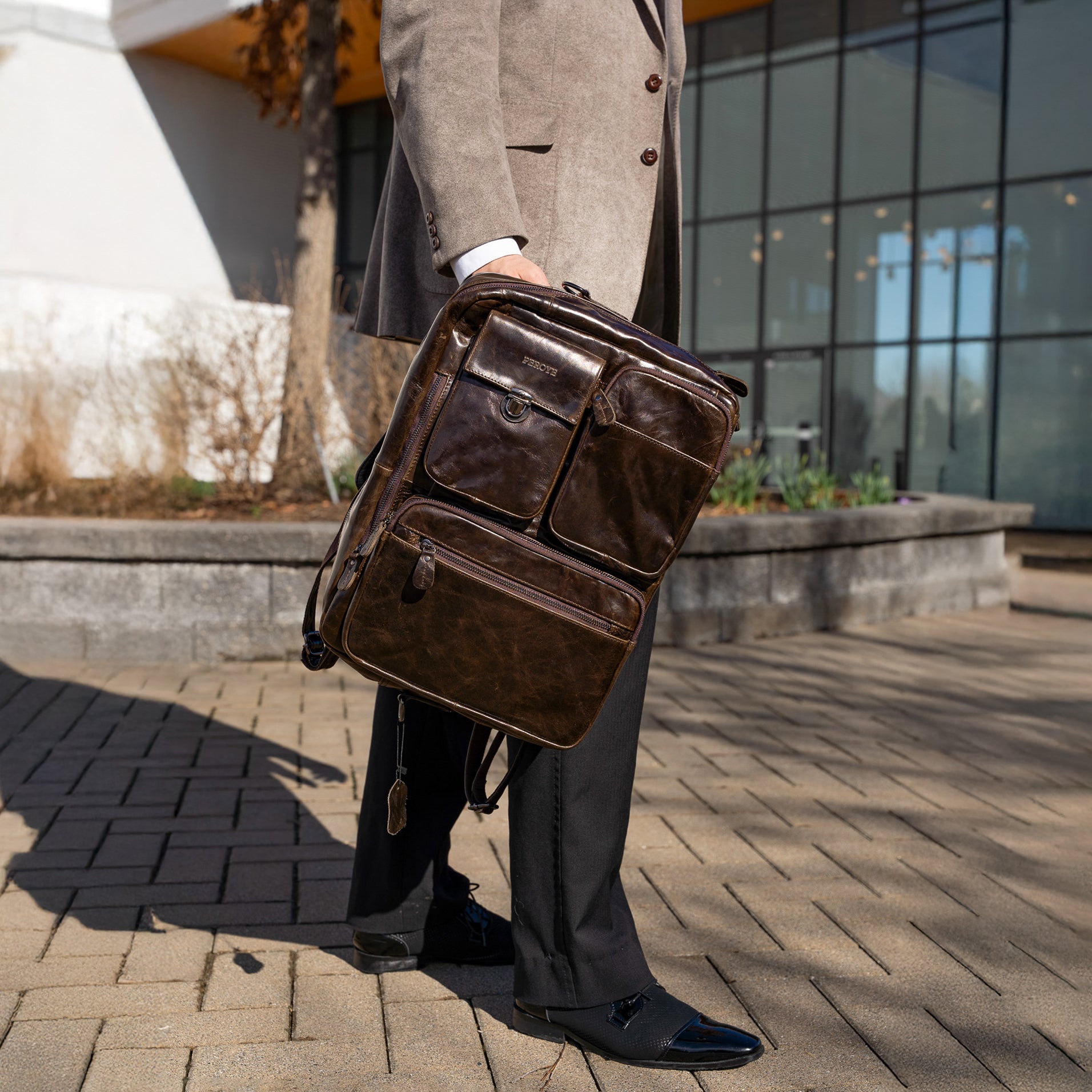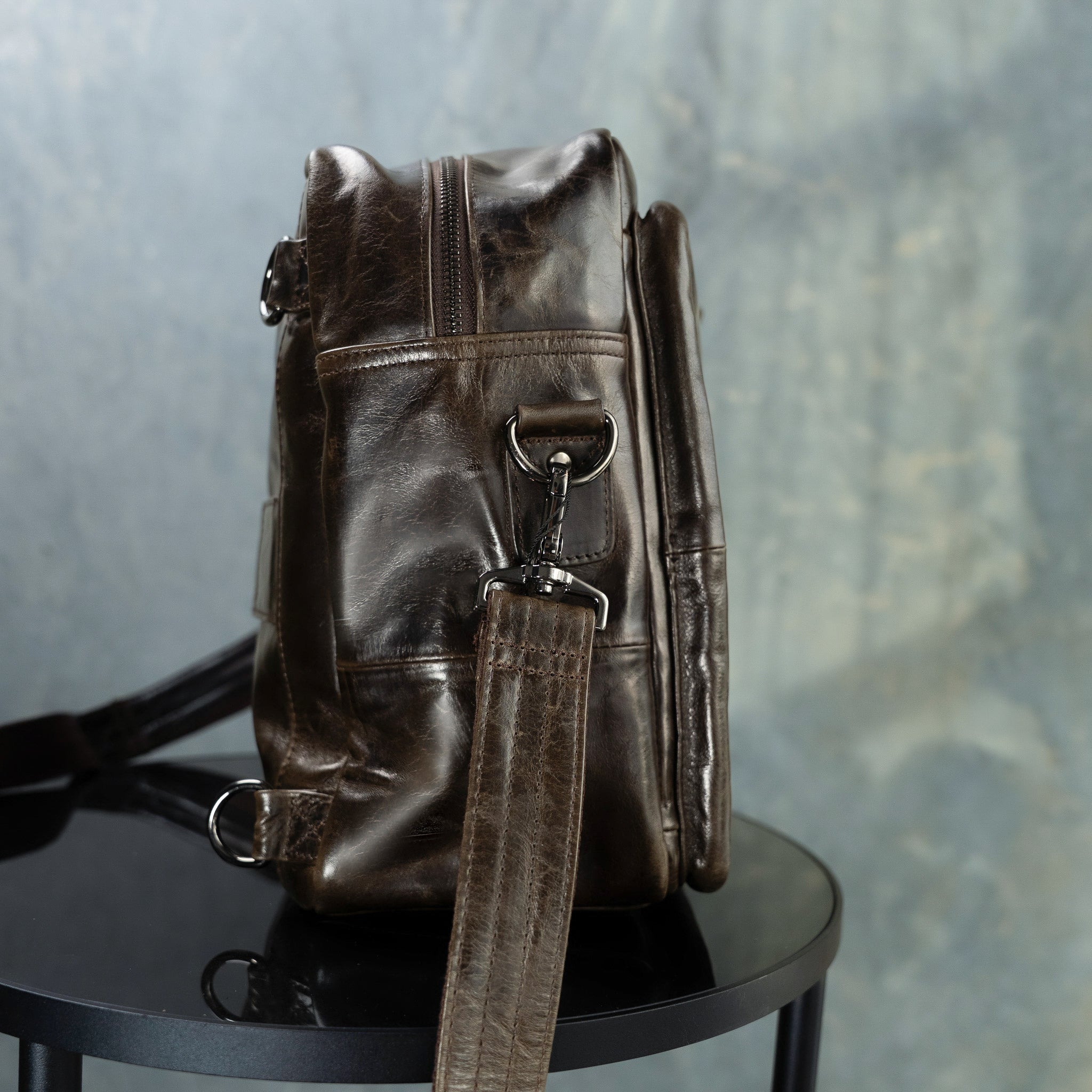 Handcrafted from coffee-colored full-grain leather, Fielder I balances aesthetics with utility for unisex appeal.